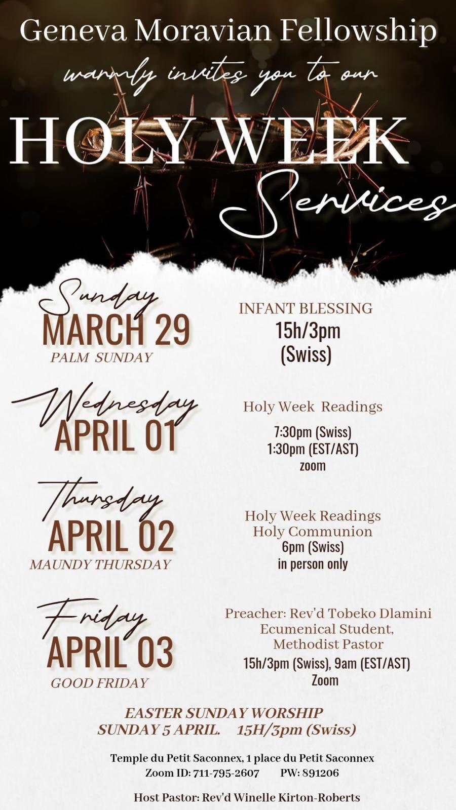 - Wednesday 1 April, Holy Week reading and Lenten message, 19h30, 3 April Good Friday, 15h Good Friday readings. Meeting ID: 711 795 2607 Password: 891206 Sunday, 5 April, Easter Service